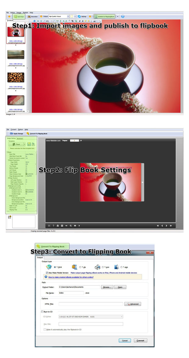 With Image to Flippingbook3D, you can create attractive 3D image slideshow from Image files with three steps only, no coding skills or program knowledge needs. Load Image file into the program firstly, then define template settings to customize book layout,and output flipbook as HTML; EXE, ZIP or APP format at last. So easy!